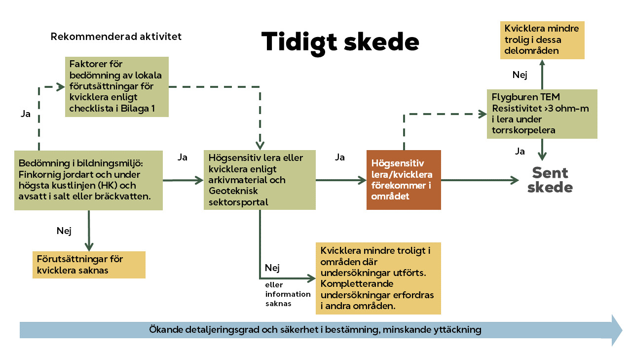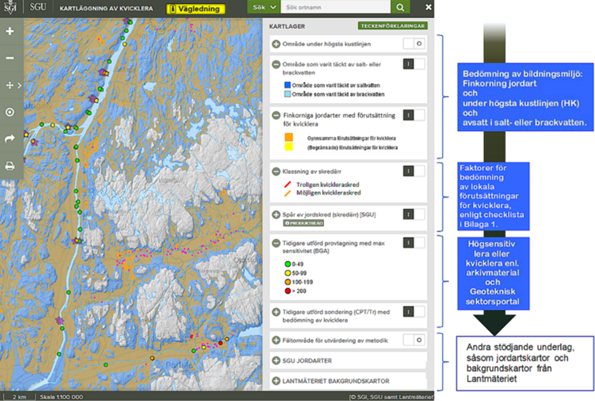 Med hjälp av checklistan och nästföljande kartskikt, Klassning av skredärr (och spår av jordskred), kan fortsatt analys göras om lokala förutsättningar för kvicklera är vanligt förekommande i området och i så fall var inom området. Det sista steget som kartvisningstjänsten stödjer är frågan om högsensitiv lera eller om kvicklera förekommer. I karttjänsten ges information om lerors sensitivitet från utförda provtagningar samt bedömningar av förekomst av kvicklera från punktvis sondering.