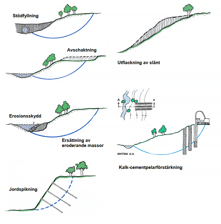 I Skredkommisionens rapport 5:95 hittar du exempel på olika typer av skredförebyggande åtgärder. Illustrationen nedan är tagen därifrån. Skredkommisionen är avvecklad men hade som uppgift att samordna forskning och sprida information om släntstabilitet, jordskred och metoder för förebyggande åtgärder.