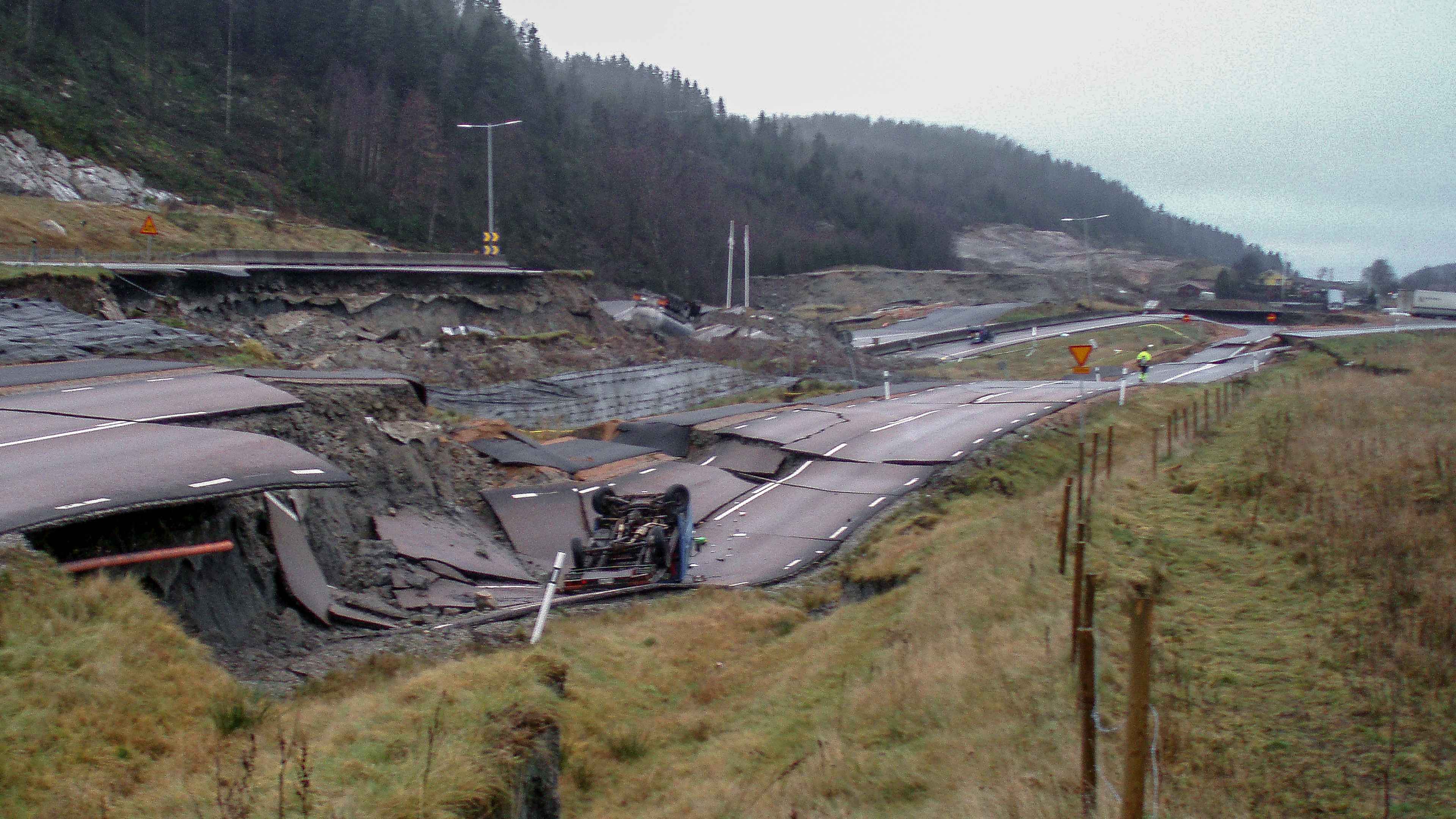 I skredets bakkant (aktivzonen) sjönk marken i höjdled med maximalt ca 7,5 m. Blottad bergyta i väster stupade ca 30 grader. Av de 28 förare och passagerare som fanns i de 13 fordonen inom skredområdet fördes sammanlagt 13 till sjukhus. Nio fördes till Uddevalla sjukhus,varav sex bedömdes som mycket lindrigt skadade eller oskadade. Fyra patienter fördes till Norra Älvsborgs Länssjukhus i Trollhättan. Alla fyra bedömdes som mycket lindrigt skadade eller oskadade.