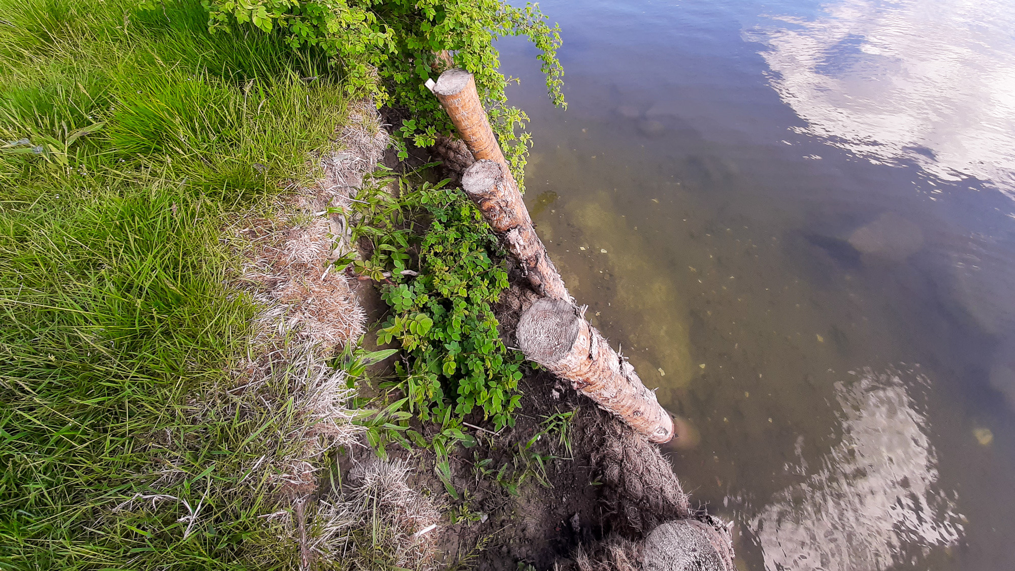 Kokosfiberrullarna minskar effekten av fartygsvågorna, samt fångar upp sediment som eroderar bort från strandbrinken och växter kan återetablera sig.