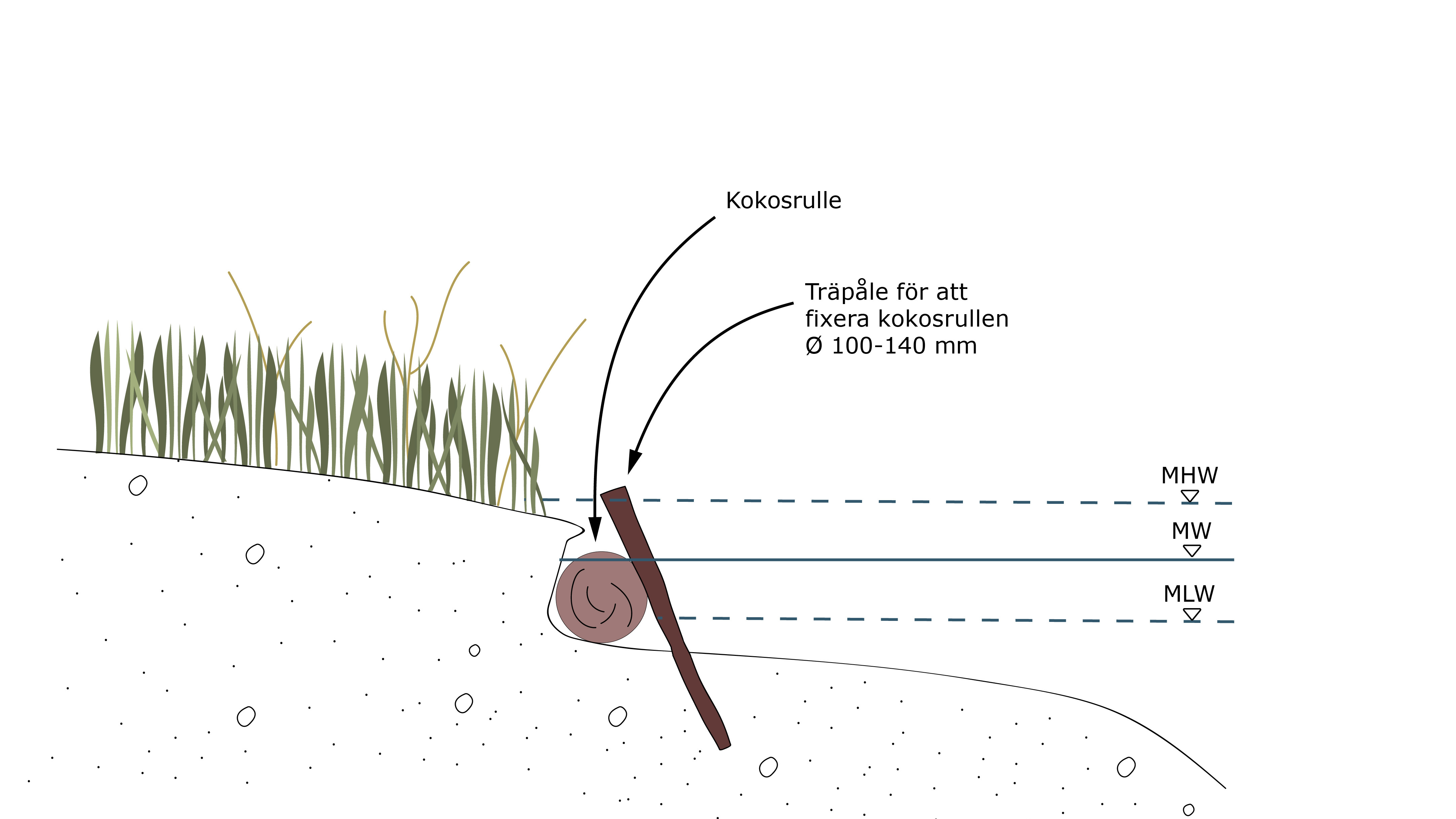 Illustration av kokosfiberrullar fixerade med sned träpåle. (Illustration: SGI)