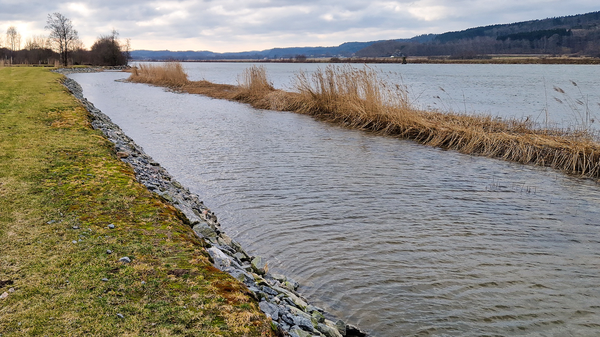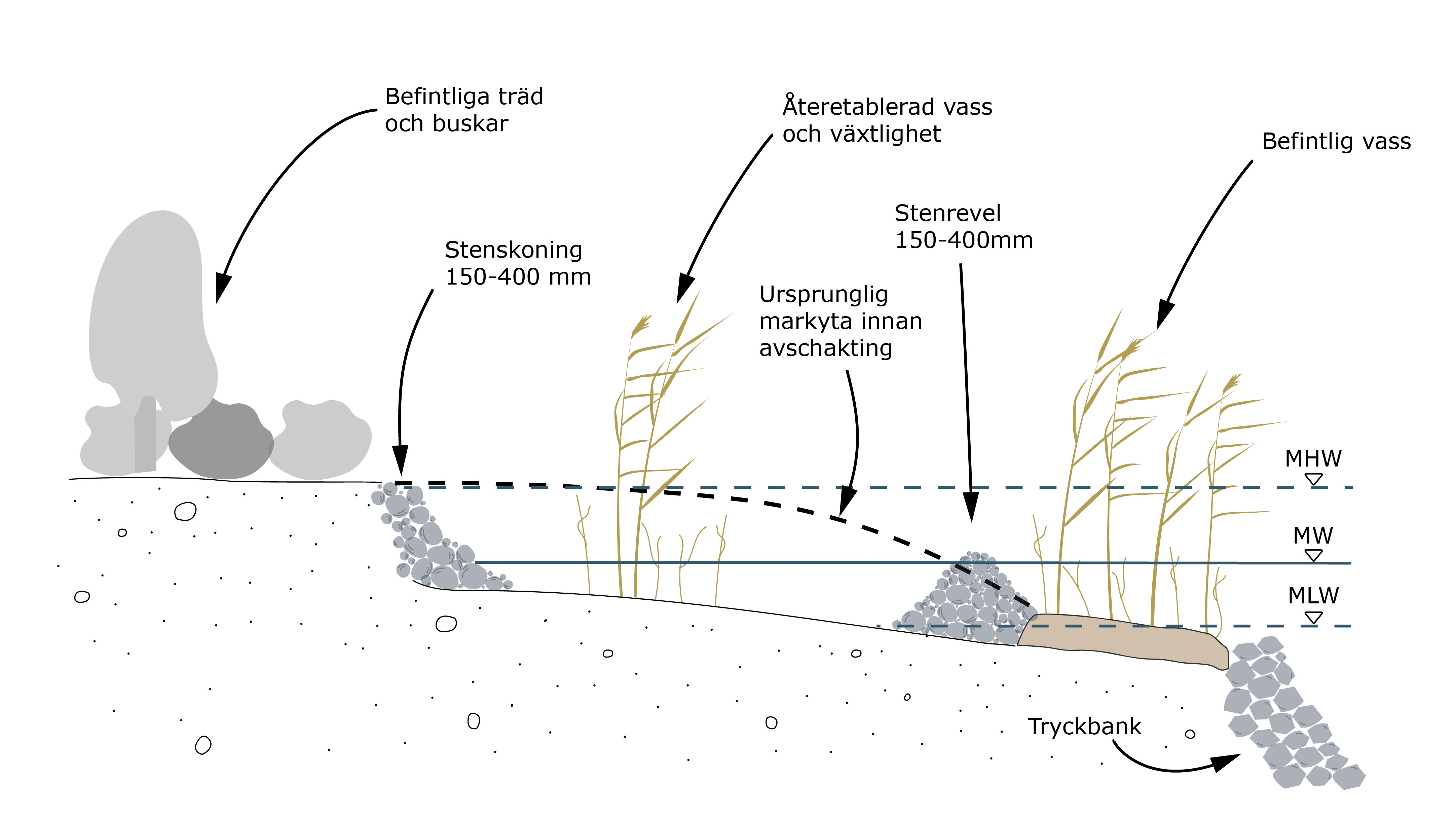 En yta mellan tryckbanken och strandbrinken har avschaktats för att förbättra stabiliteten. En stenrevel har placerats ut strax ovanför tryckbanken, och strandbrinken har fått en stenskoning. Området mellan stenskoningen och stenreveln har lämnats bar för återetablering av vass och andra vattenväxter.