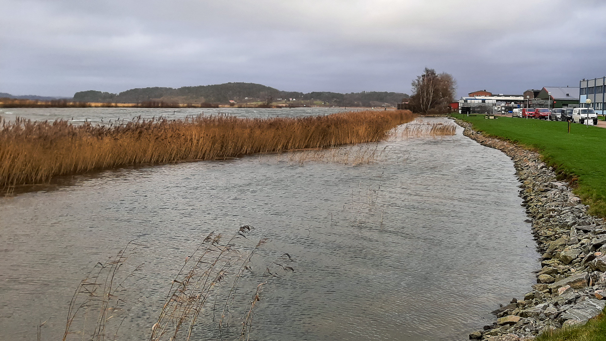 Lösningens utformning mot land, med stenskoning och gräsmatta, ger få eller inga naturvärden.