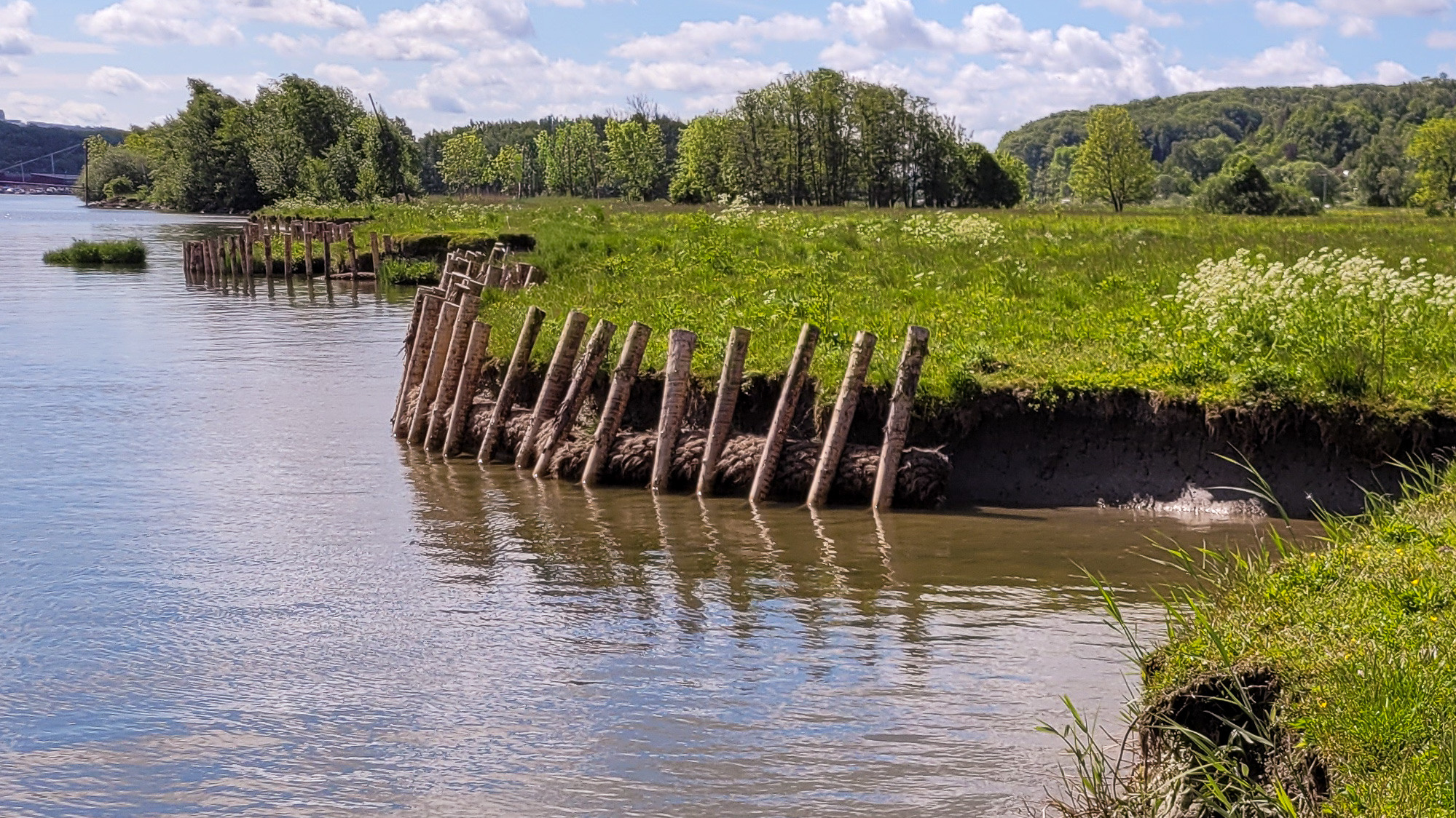 Fartygsvågor och strömmande vatten eroderar strandängar. Jordarten i området består av lera, och det finns ett tydlig eroderande, lodrät strandbrink. |